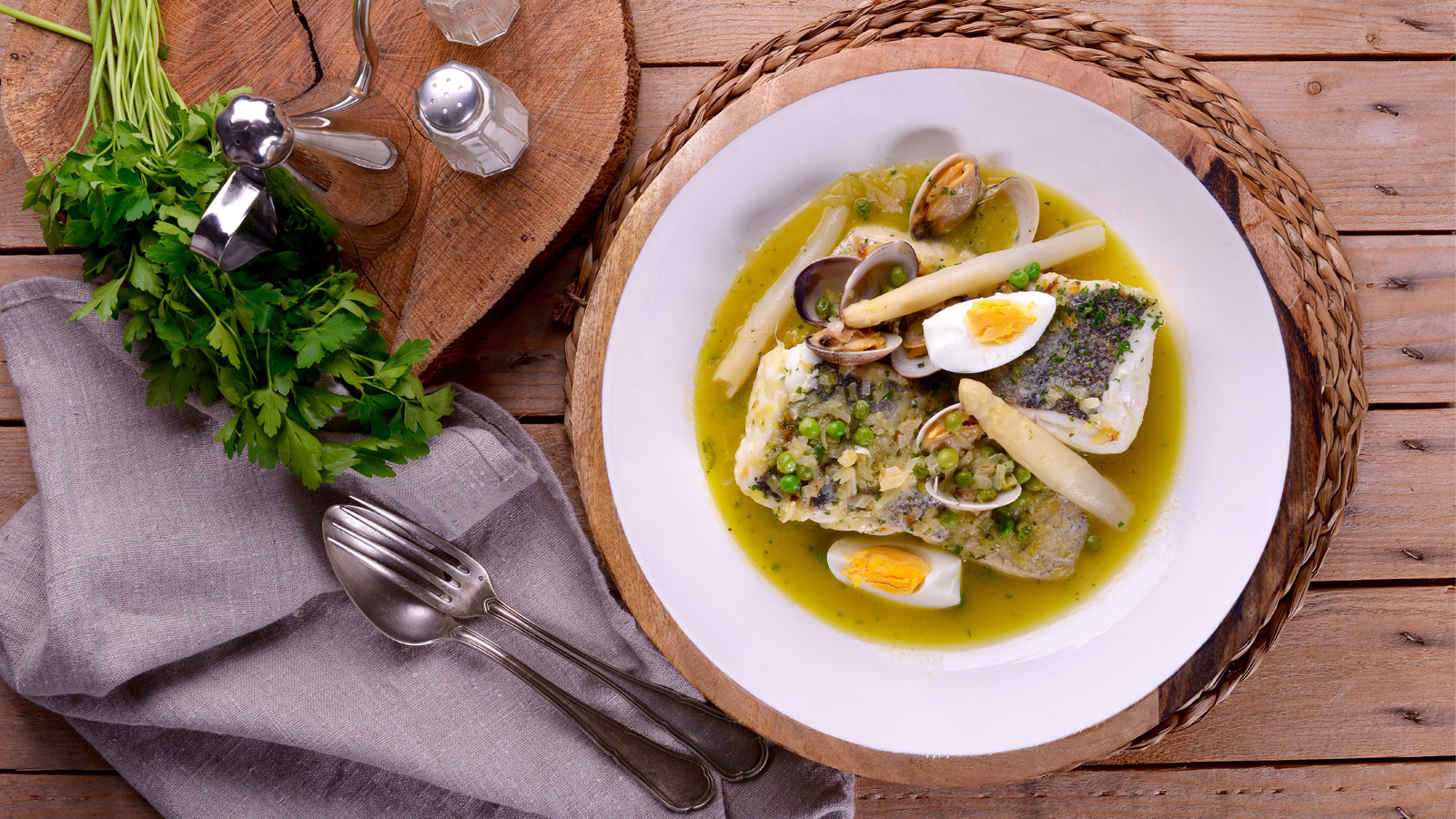 Cuando la merluza esté tierna y las almejas abiertas, añadimos los espárragos, el huevo cocido rallado y un puñado de perejil picado.