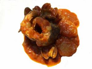 - Cuando veamos que las patatas ya están cocidas añadimos las rodajas de congrio y las almejas y mantenemos 3 minutos.