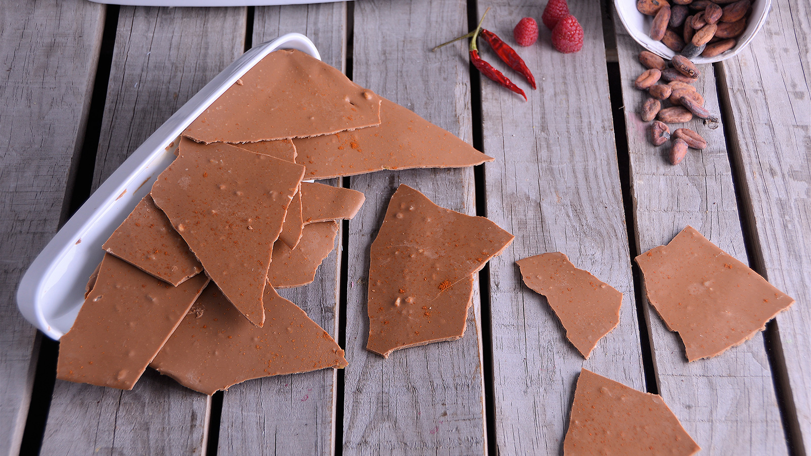 Puedes consultar las recetas de tableta de chocolate blanco y frambuesas liofilizadas y tableta de chocolate negro, pan, aceite y sal.