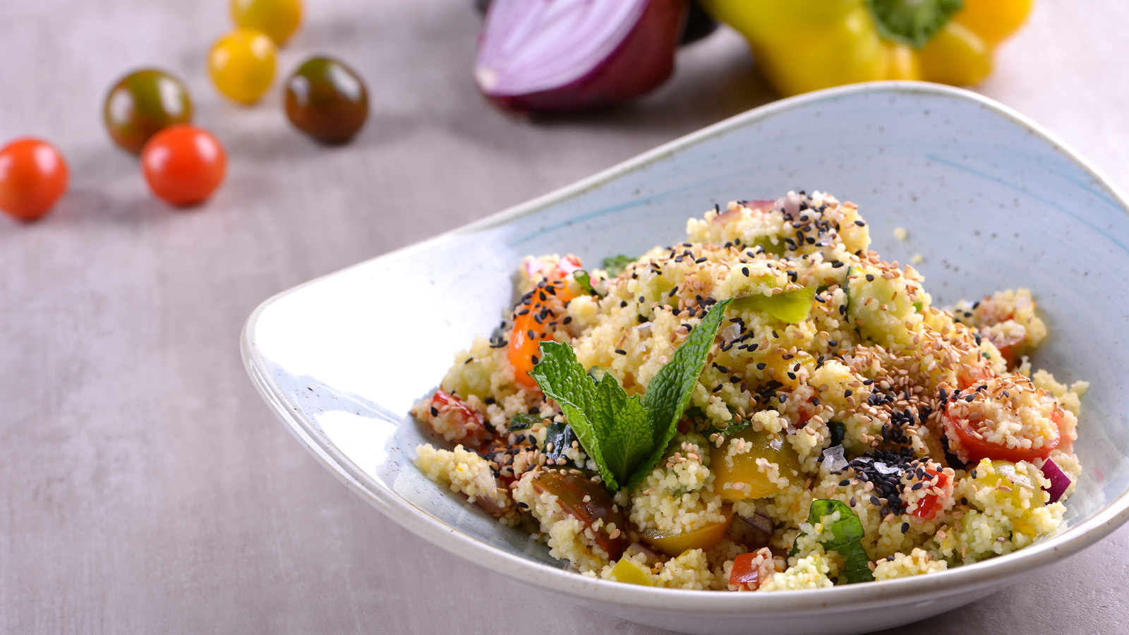Los añadimos al couscous y añadimos también el pepino picado en crudo, los tomatitos, ralladura de naranja, menta fresca picada y semillas de sésamo.
