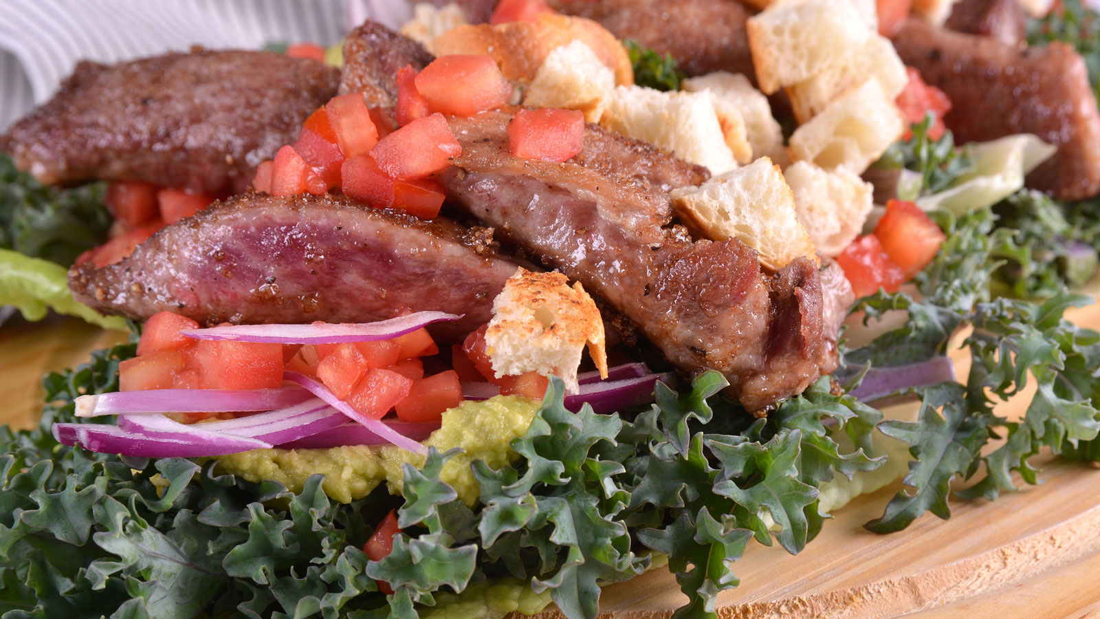 Con las hojas de kale y de lechuga romana muy limpias hacemos unos tacos poniendo una base de crema de aguacate, la presa ibérica, la cebolla, tomates y el cilantro.