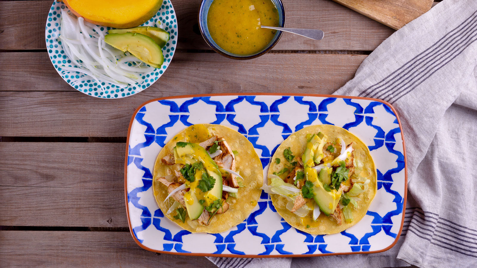 Tacos de maíz con pollo especiado y salsa súper feliz