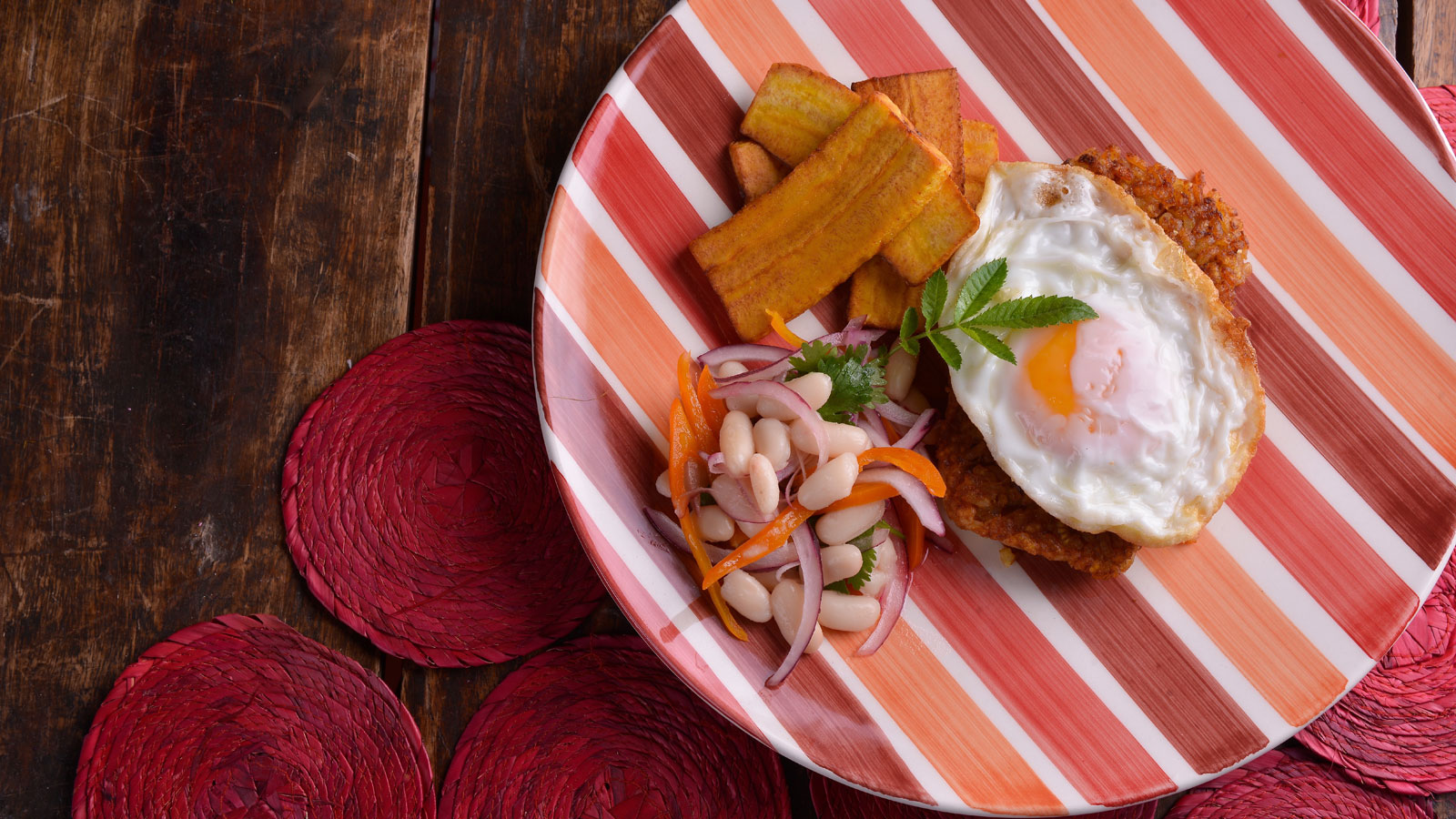 Tacu-tacu con huevo frito, ensalada de alubias y plátano frito