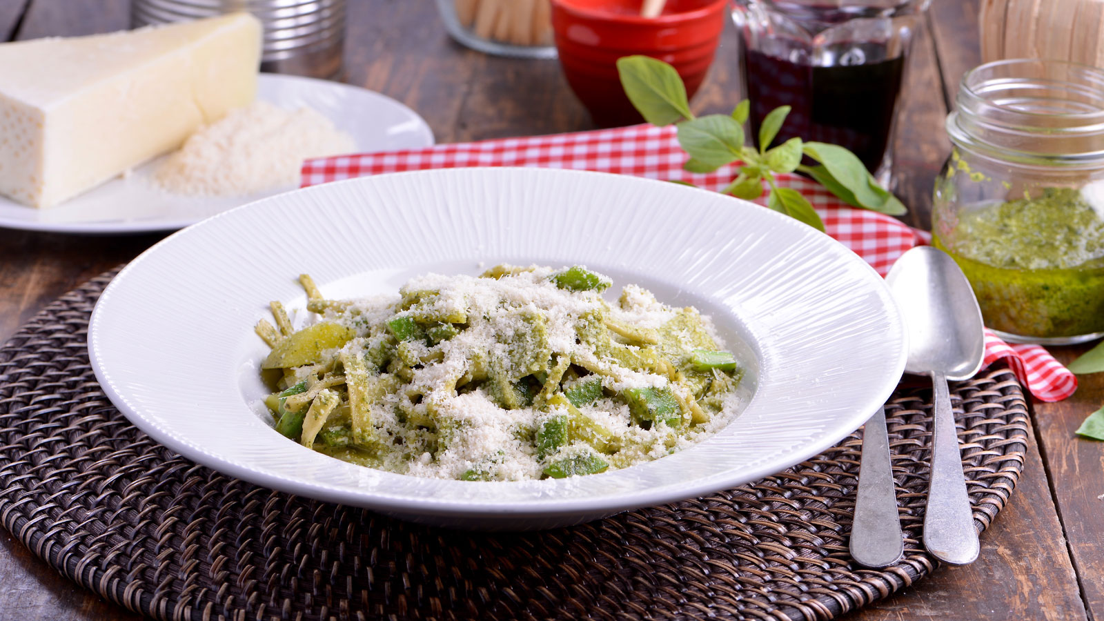 Para finalizar, servimos los tallarines acompañados con salsa pesto, las patatas y las judías verdes, queso rallado al gusto y listo.