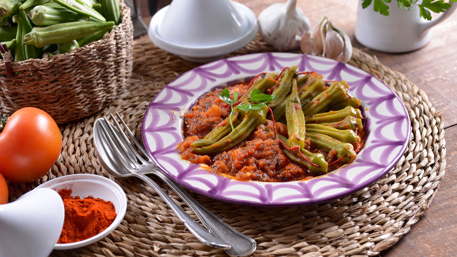En el capítulo 7 del programa de televisión Cocina marroquí, la cocinera Najat Kaanache prepara una receta de Tajín de tomate y Okra (Tajin Dial Bamia). La okra, también conocida como gumbo o ají turco, es una hortaliza de textura gelatinosa muy utilizada en los países africanos.