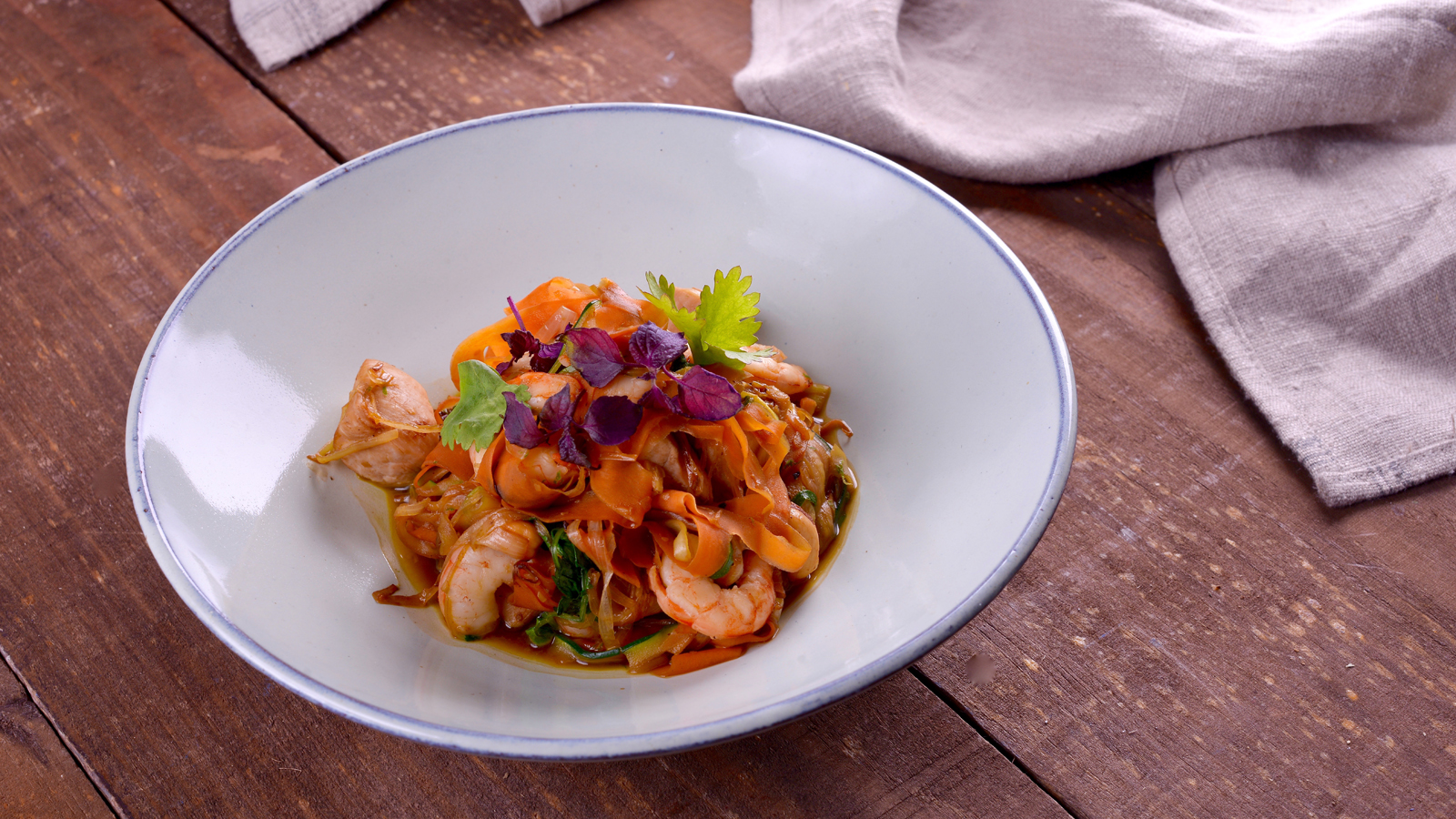 En el capítulo del programa de televisión Cocinamos contigo T6, Sergio Fernández prepara la receta de Tallarines vegetales con gambas y anacardos.