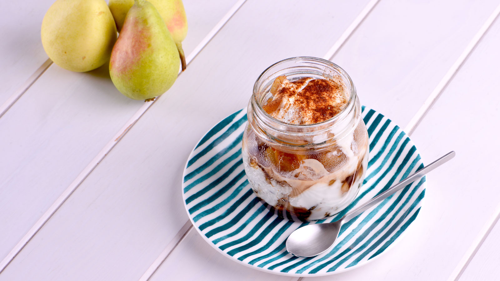 Tarrito de yogur con pera caramelizada y granola