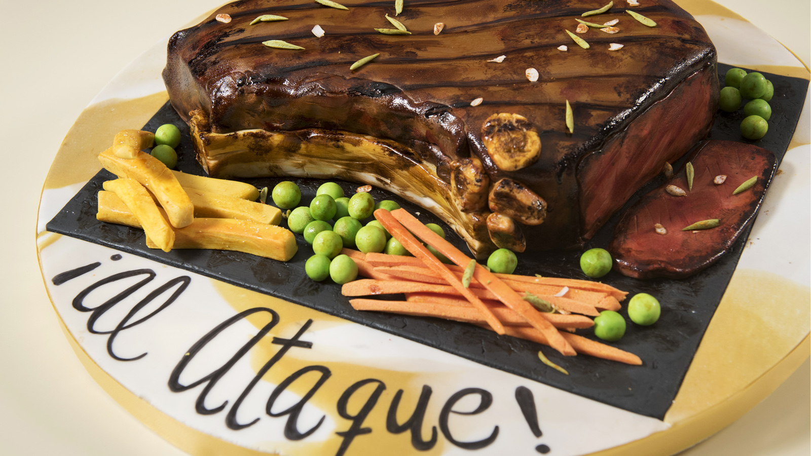 Sobre ella nosotros colocamos un rectángulo negro grande de fondant para simular el plato de pizarra sobre el que tradicionalmente se sirve el chuletón.
