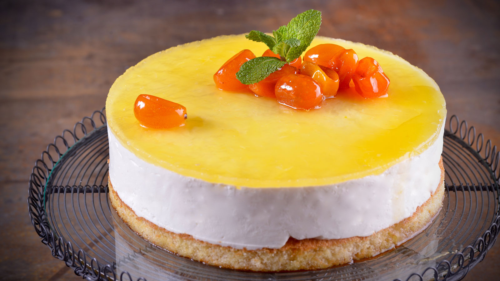 Cuando esté totalmente fría, extraemos el molde y el acetato con cuidado. Decoramos con la confitura de kunquats y unas hojitas de menta.