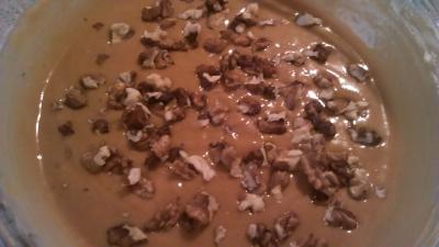 Para comenzar con el bizcocho derretimos 100 gr de mantequilla , le añadimos el azúcar moreno y removemos hasta que se disuelva. Reservamos para que se vaya entibiando. Después batimos los huevos con 130 gr de azúcar blanco y añadimos el puré, mezclamos. Una vez tibio ya podemos poner la mantequilla con el azúcar moreno derretida. Seguidamente ponemos la esencia de vainilla y la miel de caña, mezclamos de nuevo. A continuación tamizamos sobre la mezcla la harina, la levadura y el bicarbonato, removemos hasta que quede todo homogéneo. Por último añadimos la mitad de las nueces y removemos suavemente. También podemos poner un puñado por encima, para que todas no se queden en el fondo. Ahora ponemos la masa en una ensaladera, (previamente untada con mantequilla) y al horno a 180 grados 55 minutos. Antes de sacarlo lo pincharemos con un palo de brocheta, si sale limpio ya está listo, como siempre, je je je.