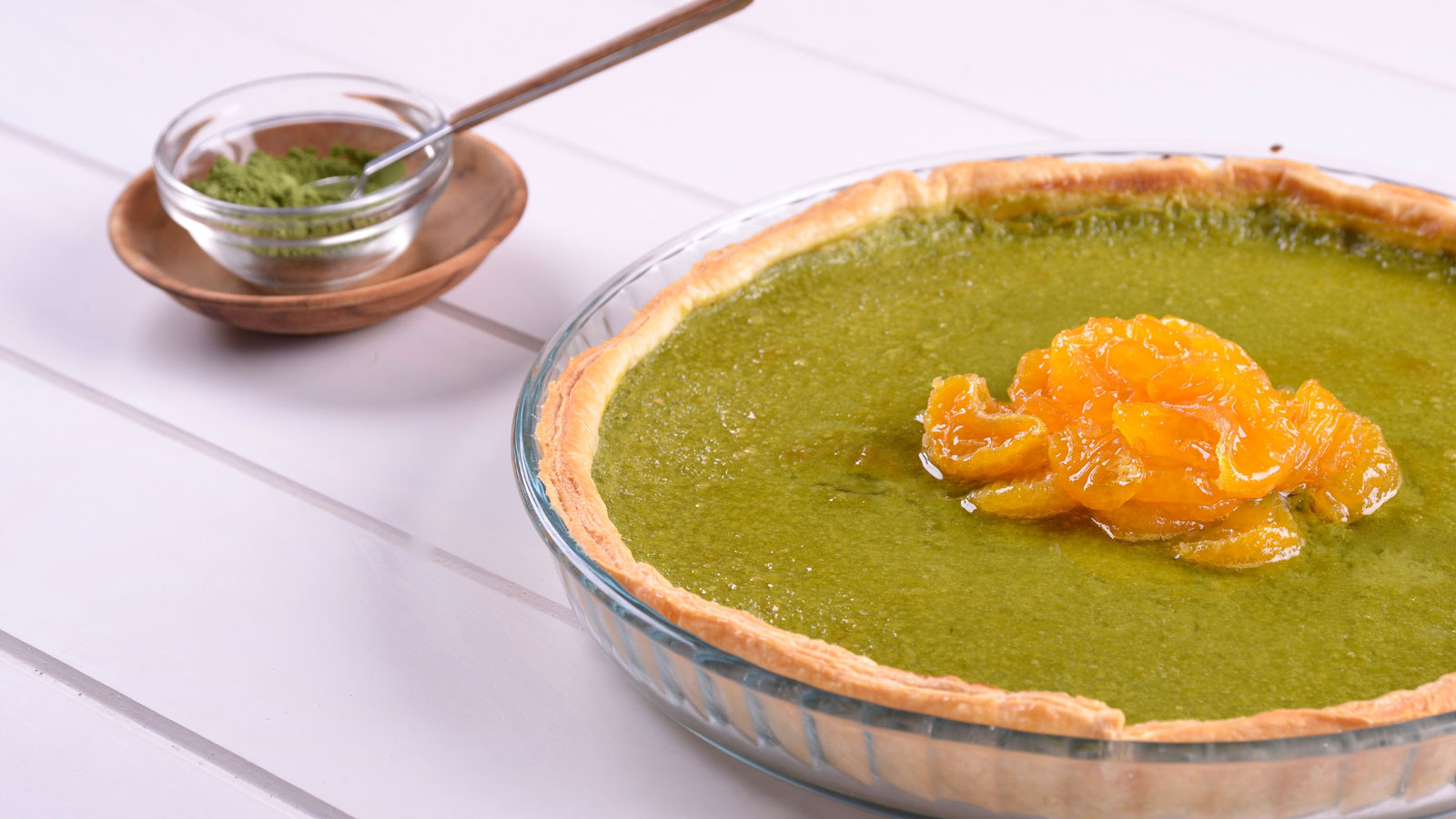 Para finalizar, colocamos las mandarinas confitadas sobre la tarta de té matcha y servimos.