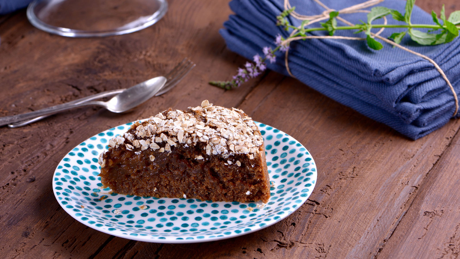En otro bol, mezclamos la harina, el bicarbonato, la levadura, la canela y la sal, y añadimos esta mezcla a la avena, batiendo bien. Cuando esté bien mezclado, ponemos la masa en el molde y espolvoreamos la superficie con copos de avena.