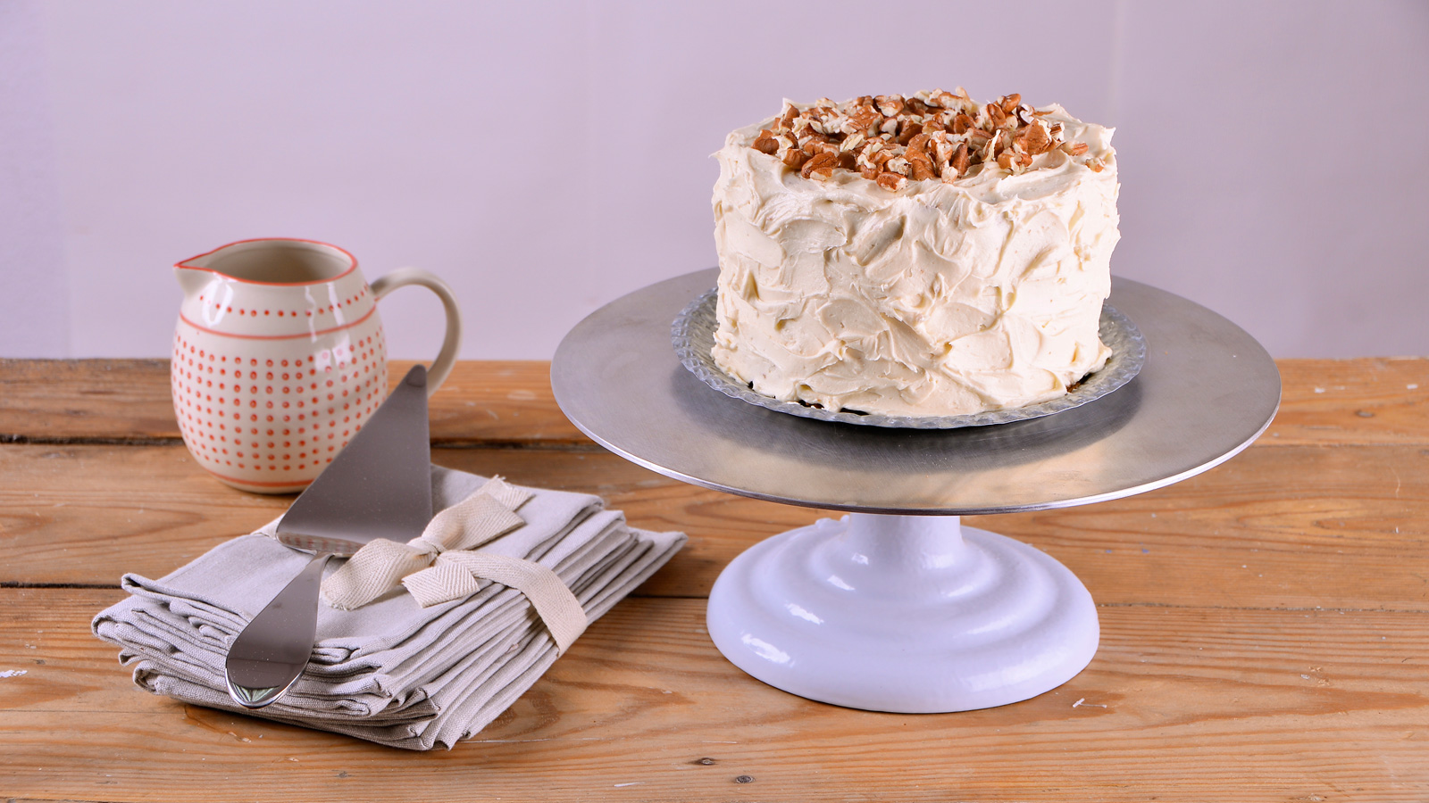 Rellenamos la tarta y la cubrimos toda con la crema de mantequilla. Decoramos la superficie con las nueces de pecan.