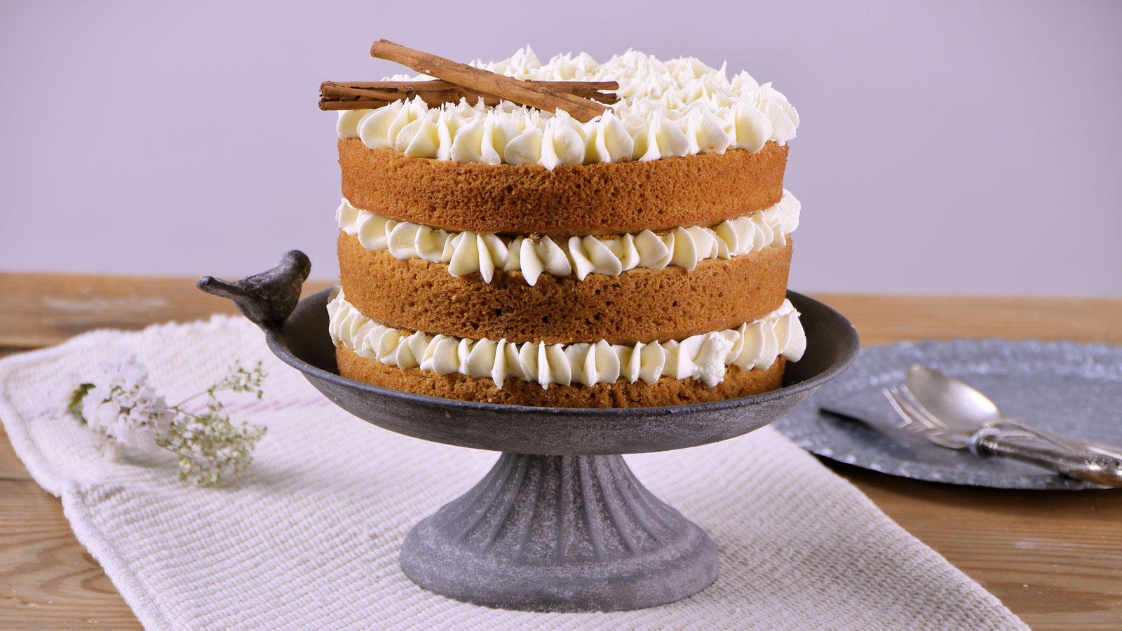 Decoramos nuestra tarta con las ramas de canela y servimos.
