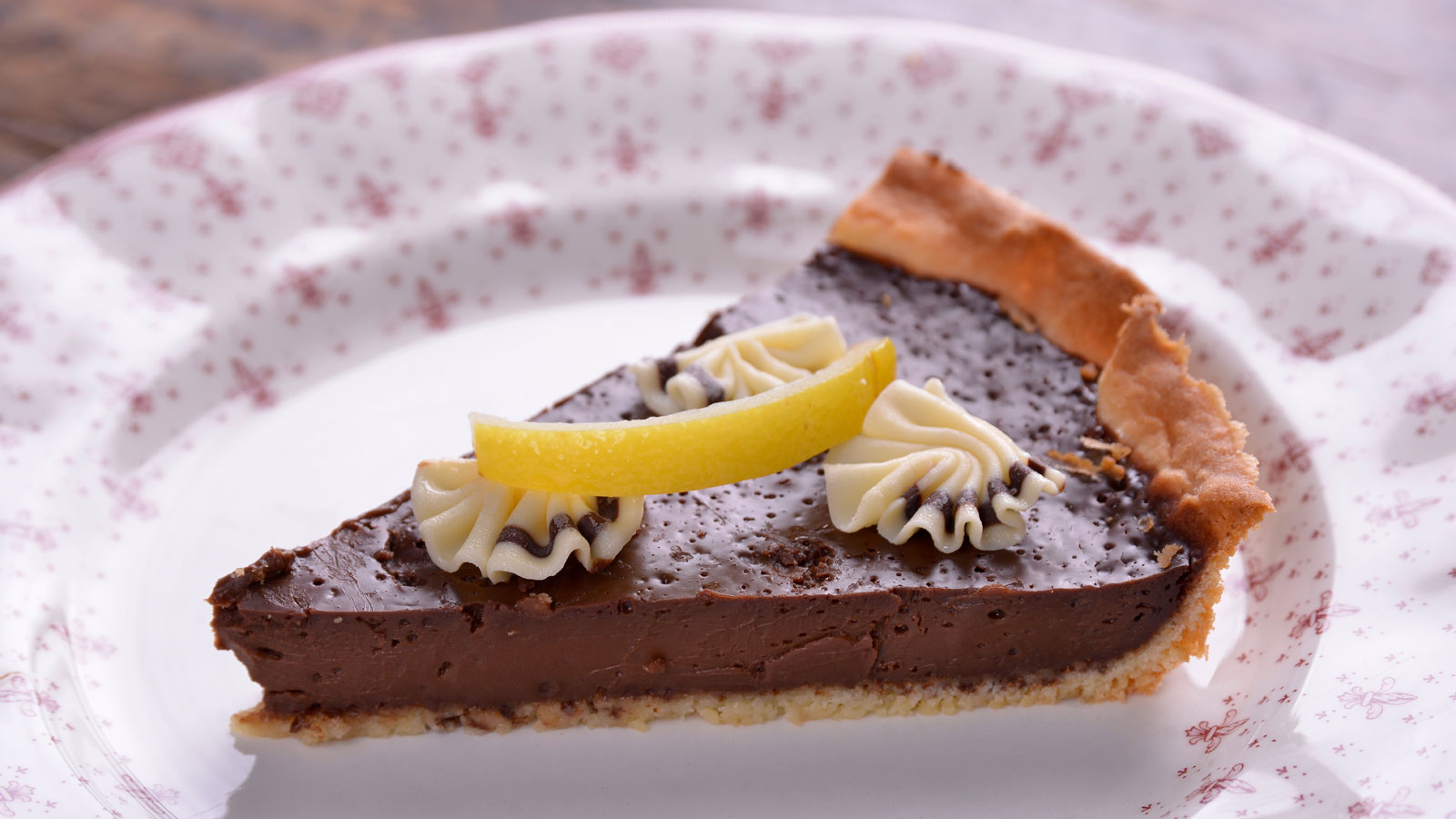 Decoramos con unas virutas de chocolate blanco y tiras de limón confitado.