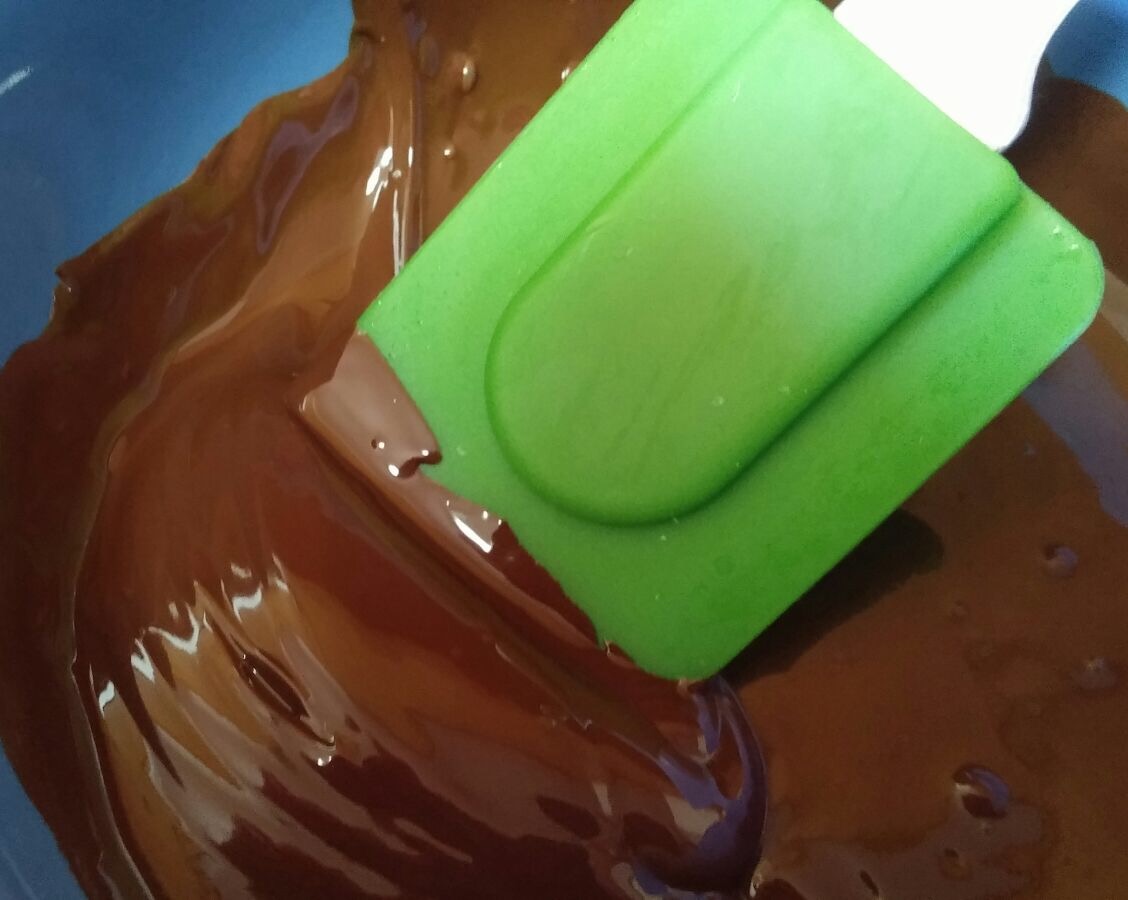 Calentamos a 100 ºC la nata y añadimos el chocolate y la glucosa, mezclamos bien y lo dejamos templar en un bol.