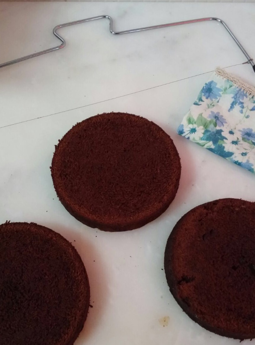 1º Cortamos nuestro bizcocho, en tres partes iguales.
