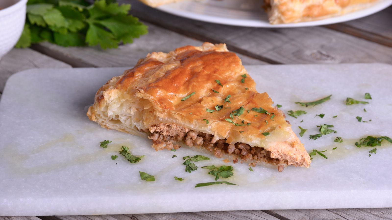Tarta de hojaldre rellena de garbanzos, cordero y ricotta