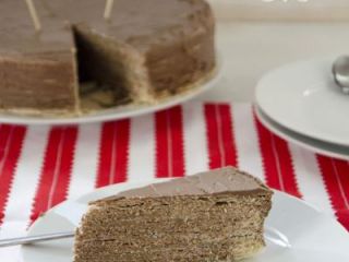 A partir de aquí, untar crema de cacao y colocar obleas sucesivamente, hasta que se alcance el tamaño que se quiera. Cuando se terminen las obleas, cubrir con crema de cacao.