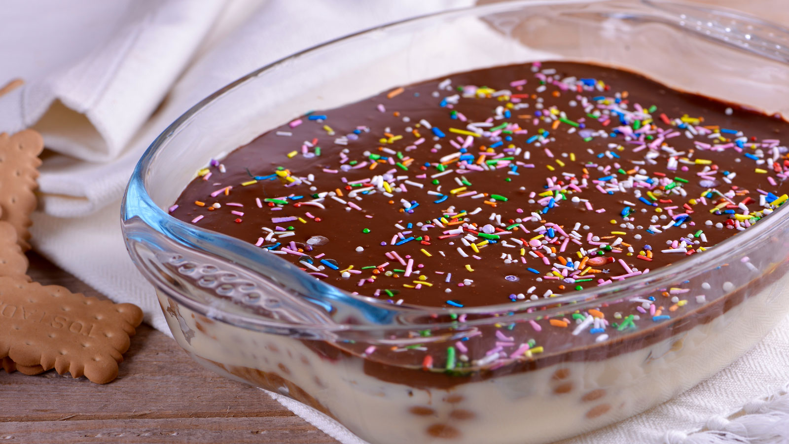 Seguidamente, extendemos la crema pastelera tibia sobre las galletas. Después, cubrimos con otra capa de galletas empapadas en leche y guardamos la tarta en el frigorífico mientras preparamos el ganache.