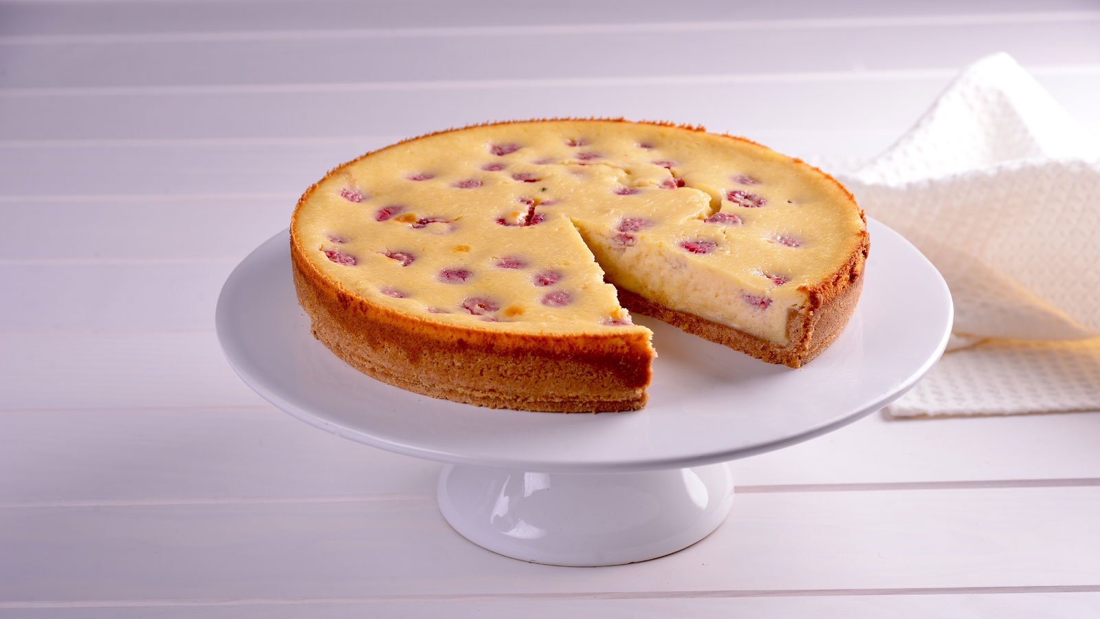 Tarta de queso con chocolate blanco, frambuesas y limón