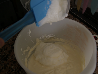 Le añadimos las claras al punto de nieve. Lo volvemos a remover todo con una espatula con movimientos de abajo a arriba para no perder la cremosidad de las clar