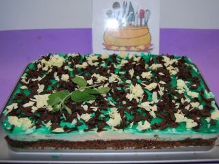 Dejamos un minuto perder temperarutura, y echamos sobre la tarta de mascarpone y dejamos cuajar en el frigo…1 hora, terminamos decorando con lascas de chocolate blanco y negro y unas hojas de menta.