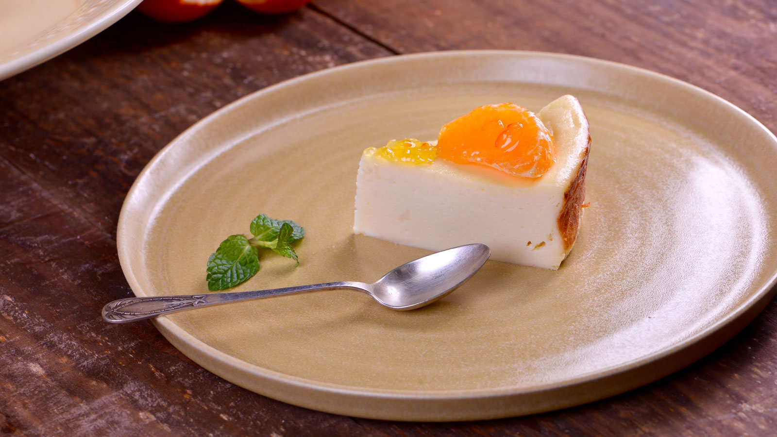 Decorar la superficie de la tarta con los gajos de mandarina dispuestos decorativamente en forma de abanico.