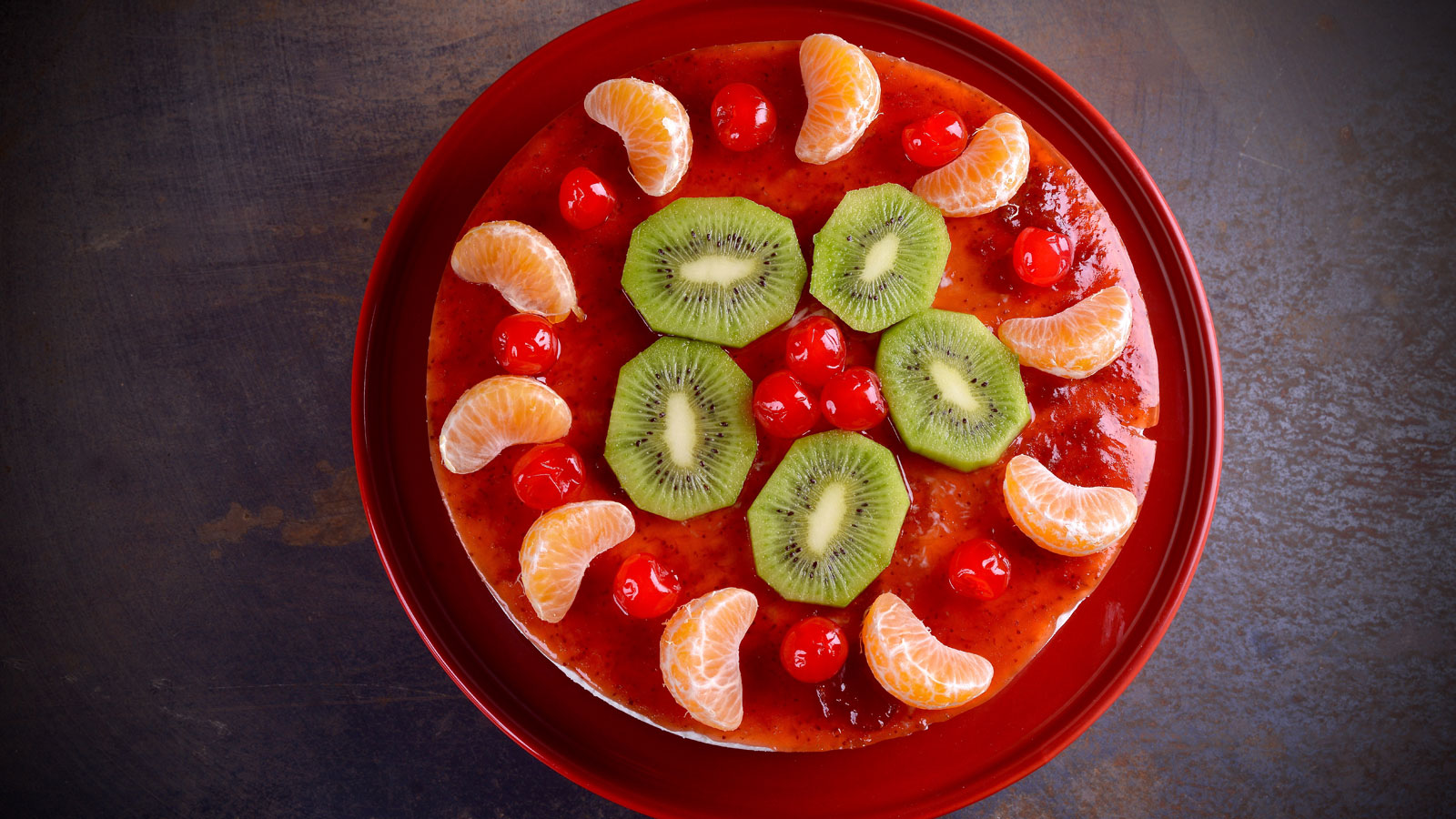 Dejamos enfriar en la nevera un mínimo de 6 horas, aunque es mejor de un día para otro. Una vez pasado este tiempo, cubrimos nuestra tarta con 340 g de mermelada y decoramos la superficie de la misma con la fruta que hayamos elegido. Si es necesario calentamos la mermelada en un cazo con un poco de agua para diluirla.