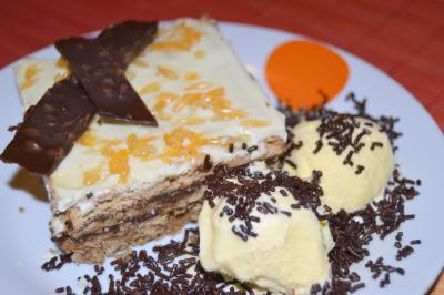 Tarta dos chocolates con crujiente de mandarina y helado de vainilla