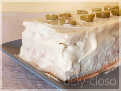 Una vez desmoldado cubrimos la tarta con una capa generosa de mahonesa y decoramos con unas aceitunas.