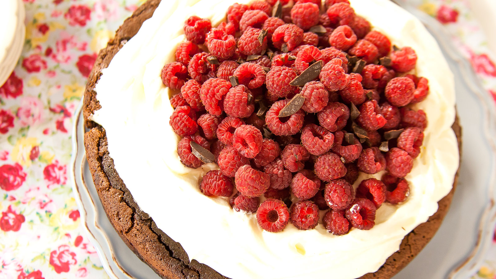 Servimos con abundante nata, frambuesas y chocolate picado.
