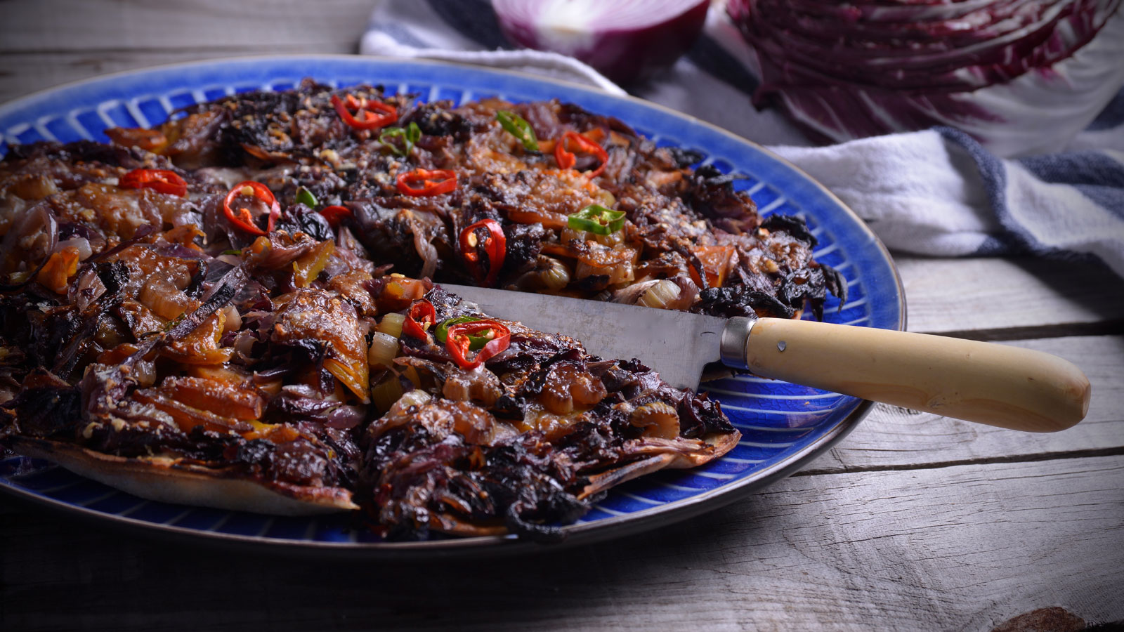 Ponemos el disco de masa en una bandeja apta para horno y pincelamos con un poco de aceite. Sobre ella colocamos la mezcla de verduras y horneamos unos 20 minutos.