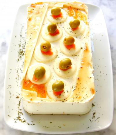 PREPARACION:Verter en un cazo la leche,nata,queso,sal pimienta y eneldo.Llevar a ebullición sin dejar de mover para mezclar todos los ingredientes.Cuando comience a hervir echar la gelatina(que ya habremos disuelto en un poco de leche fria) Bajar la temperatura a media-baja sin dejar de mover para que la gelatina se disuelva por completo.Desmenuzar el salmón y agregarlo junto con 2 cucharadas de mermelada de tomate.Mezclar unos segundos sin dejara de mover y retirar. Verter en un molde y dejar a temperatura ambiente y posteriormente lo meteremos en el frigorifico unas 12 horas.Se decora a gusto pincelando con la mermelada restante.Se sirve frio.