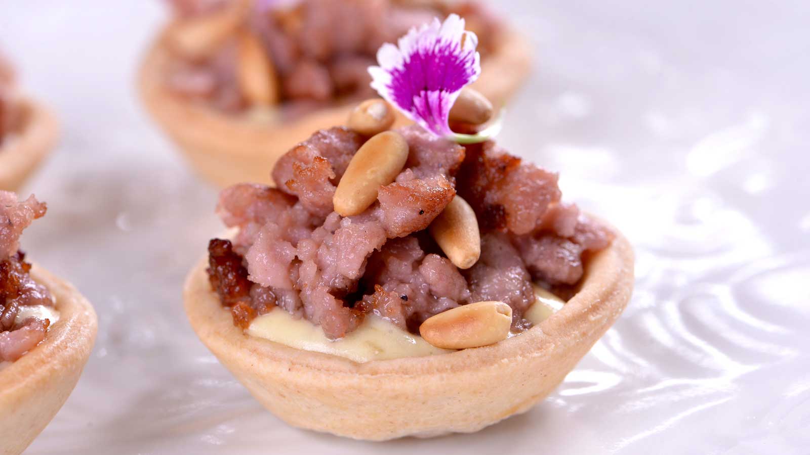 En el capítulo 22 del programa de televisión Masas saladas, Rocío Arroyo prepara la receta de Tartaleta de butifarra, patata y piñones.