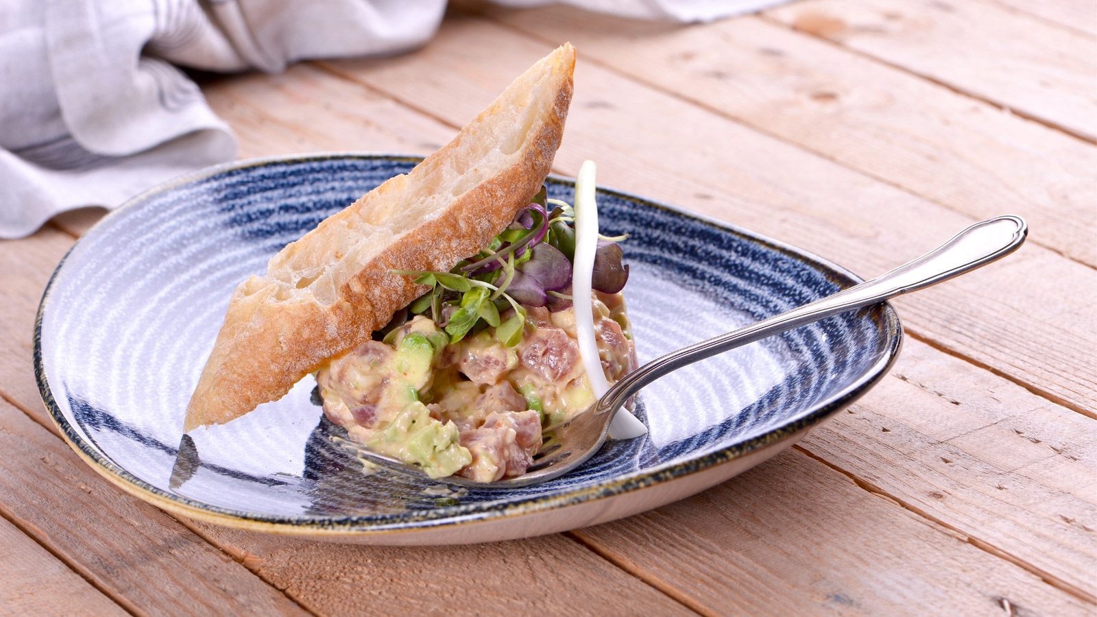 Mezclamos el atún con la salsa, emplatamos y decoramos con el pan y el micromezclum.