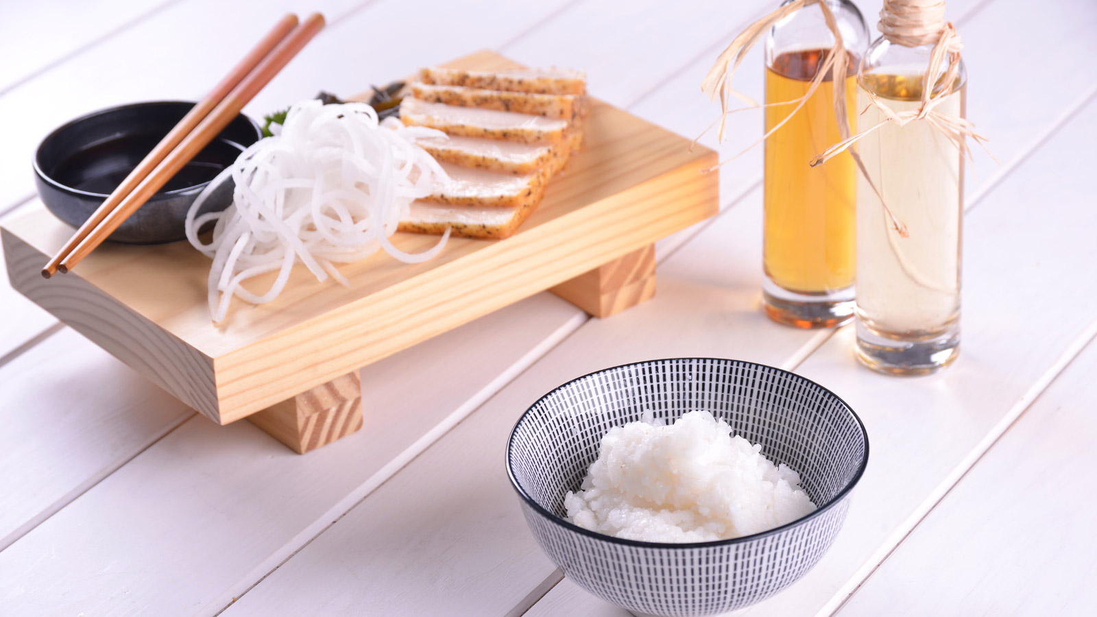 A continuación, cortamos el pez mantequilla en láminas de unos 2 cm de grosor y lo emplatamos con los espaguetis de mar, las tiras de nabo bien escurridas, el arroz blanco y, por último, la salsa de soja y mirin que hemos preparado.