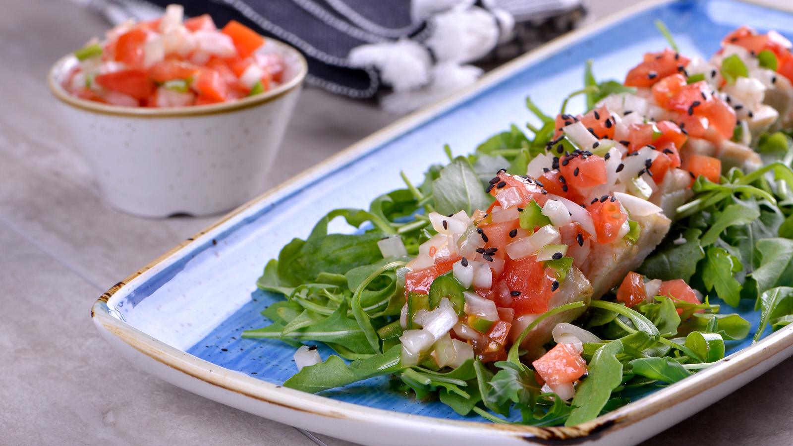 Cortar el pez mantequilla en rodajas finas y colocar sobre una cama de rúcula, con sal en escamas, poner encima el picadillo anterior y cubrir con semillas de sésamo negras.