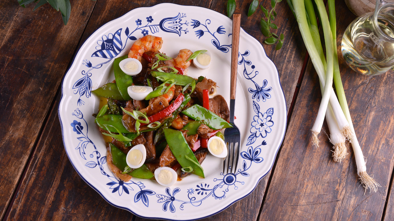 Salteamos durante 30 segundos y añadimos 50 g de espárragos trigueros limpios, media taza de setas chinas, media taza de pimiento rojo cortado en juliana, media taza de tirabeques y una cucharada de jengibre fresco rallado. Salteamos un minuto.