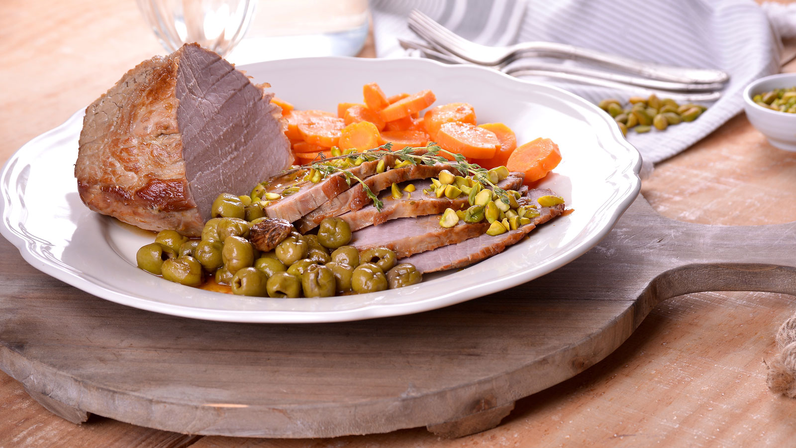 Cortamos en rodajas finas y cubrimos con aceitunas verdes y 50 g de pistachos pelados.