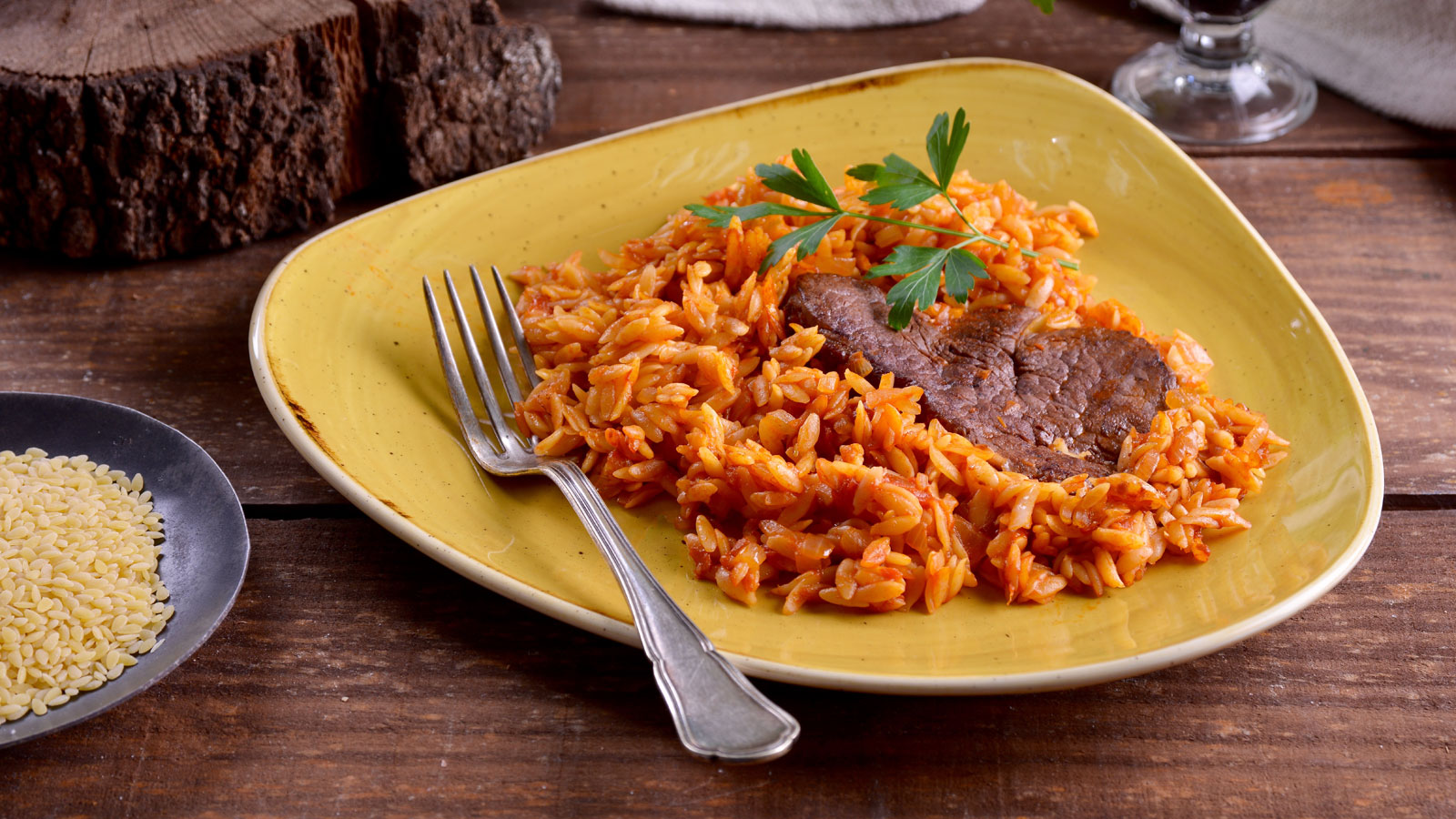 En el capítulo 17 del programa de televisión Cocina griega, la cocinera María Zannia prepara esta receta de Ternera con pasta de orzo. Este plato, denominado Yuvetsi en griego, es un guiso tradicional de la cocina de Grecia que se puede elaborar con carne de ternera o cordero. En esta ocasión, María Zannia incorpora la pasta de orzo, que es una pasta de sémola de trigo duro típica de la cocina italiana. Se emplea habitualmente como un ingrediente de sopas.