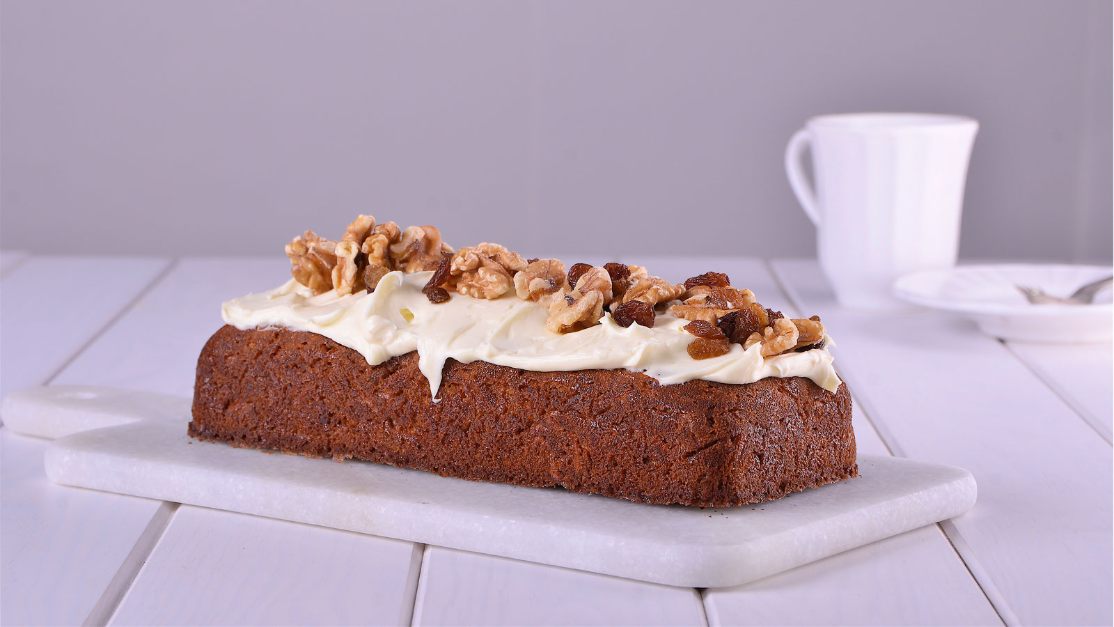 Cuando se enfríe la carrot cake, la cubrimos con el frosting por encima y la decoramos con nueces y pasas. Servimos.