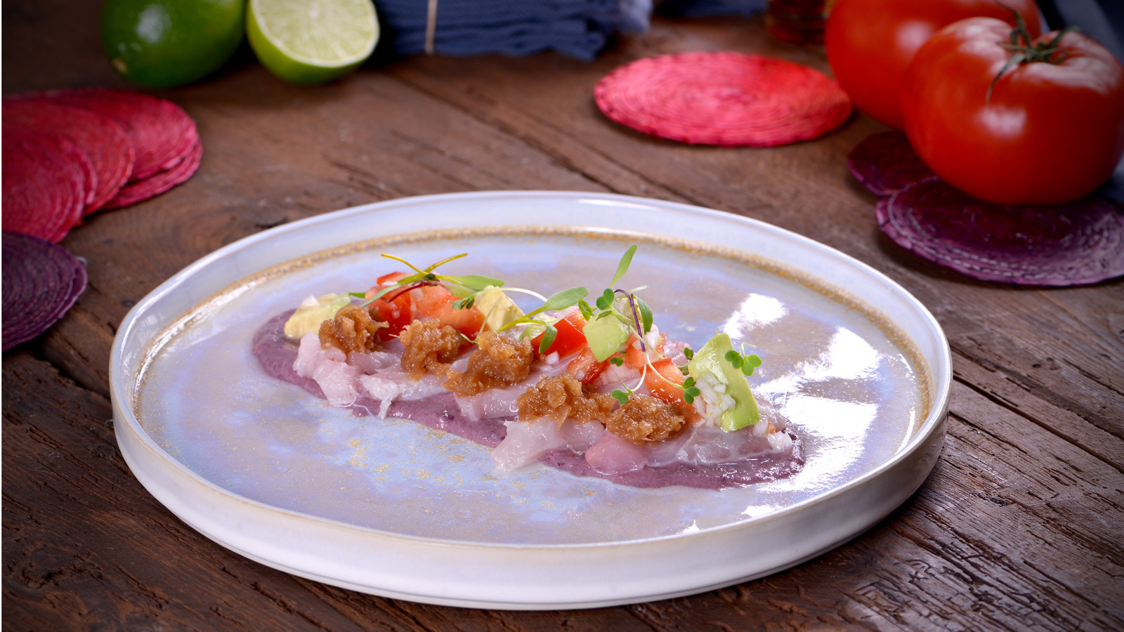 A continuación, picamos el aguacate y el tomate en cubos y lo incorporamos en un bol con la cebolla en brunoisse. Lo ponemos a punto de sal y añadimos un chorrito de zumo de lima.