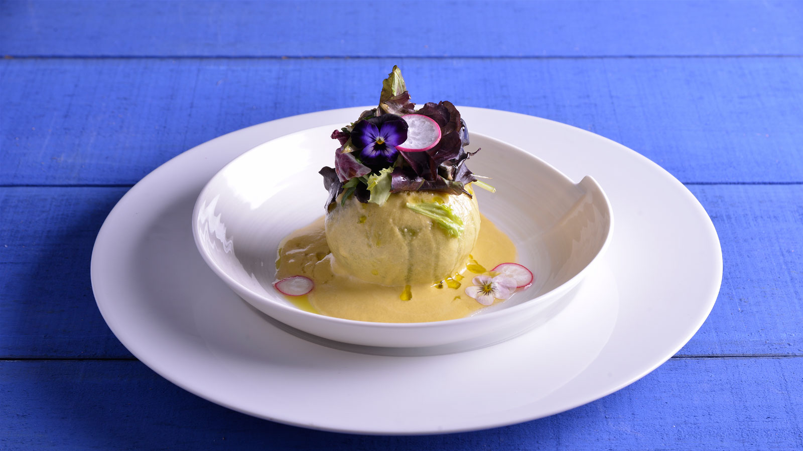 Finalmente emplatamos. En un plato a parte, rellenamos primero el tomate con el tartar de verduras. A continuación, colocamos la olivada en la base del plato con el que vamos a servirlo. Encima ponemos el tomate boca abajo. Con una cuchara rociamos el salmorejo sobre el tomate. Acabamos poniendo un cucharadita de olivada en la cima para pegar sobre ella los brotes de lechuga en forma de bouquet. Vertemos también un chorrito de aceite. Para darle el toque final decoramos con los pétalos de flor y finas tiras de rabanito.