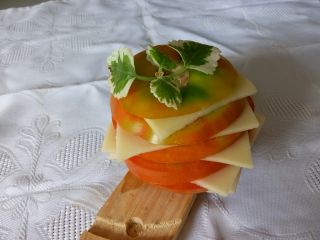 Tomate, loncha de queso, y así hasta que llegues a la parte de arriba del tomate. Recuerda que las lonchas tienen que ir en el orden en que las cortaste.