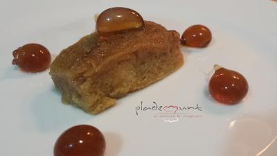 Para emplatar cortaremos una torrija en rectángulo y la acompañaremos de una esfera de cocacola hecha al momento.