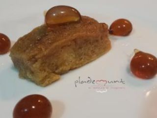 Para emplatar cortaremos una torrija en rectángulo y la acompañaremos de una esfera de cocacola hecha al momento.