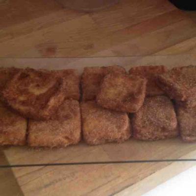 Mezclar 2 cucharadas de azucar con 1 de canela en polvo y pasar las torrijas fritas