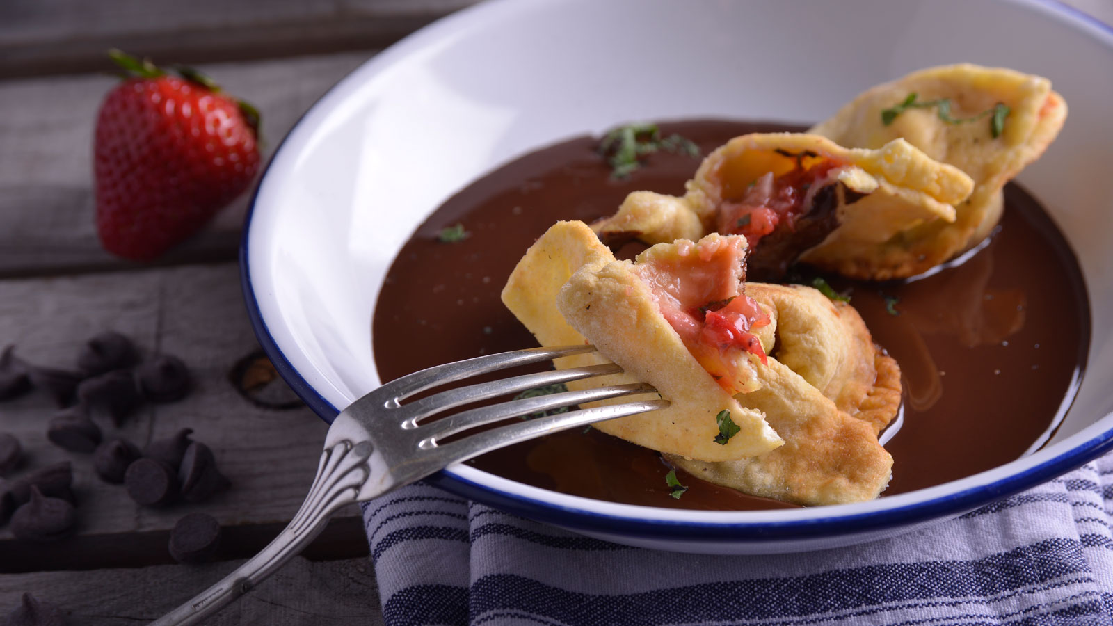 Tortellini fritos rellenos de fresas y menta sobre crema de chocolate