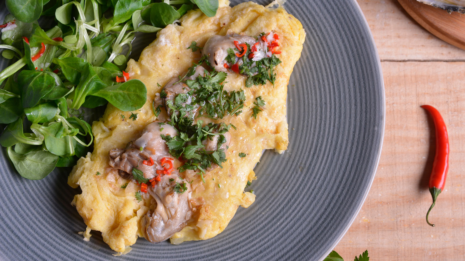 Finalmente, emplatamos la tortilla con las ostras por encima. Añadimos un poco de cilantro picado y la salsa de chile. Podemos acompañar nuestro plato con unas hojas de canónigos.